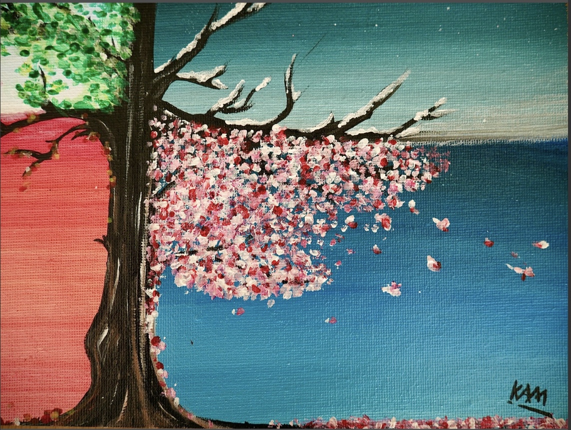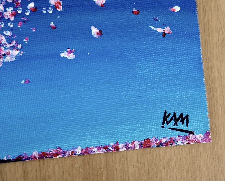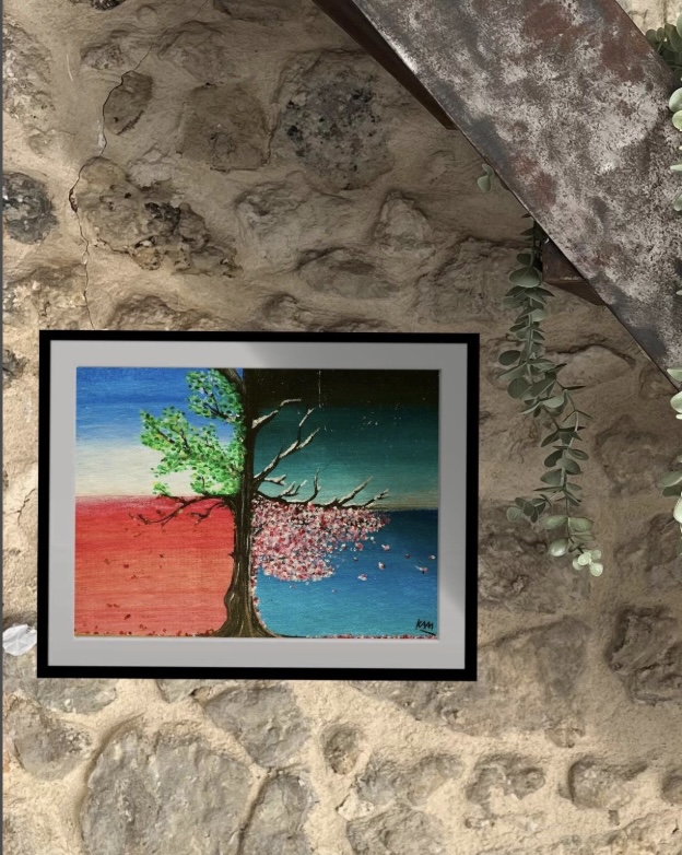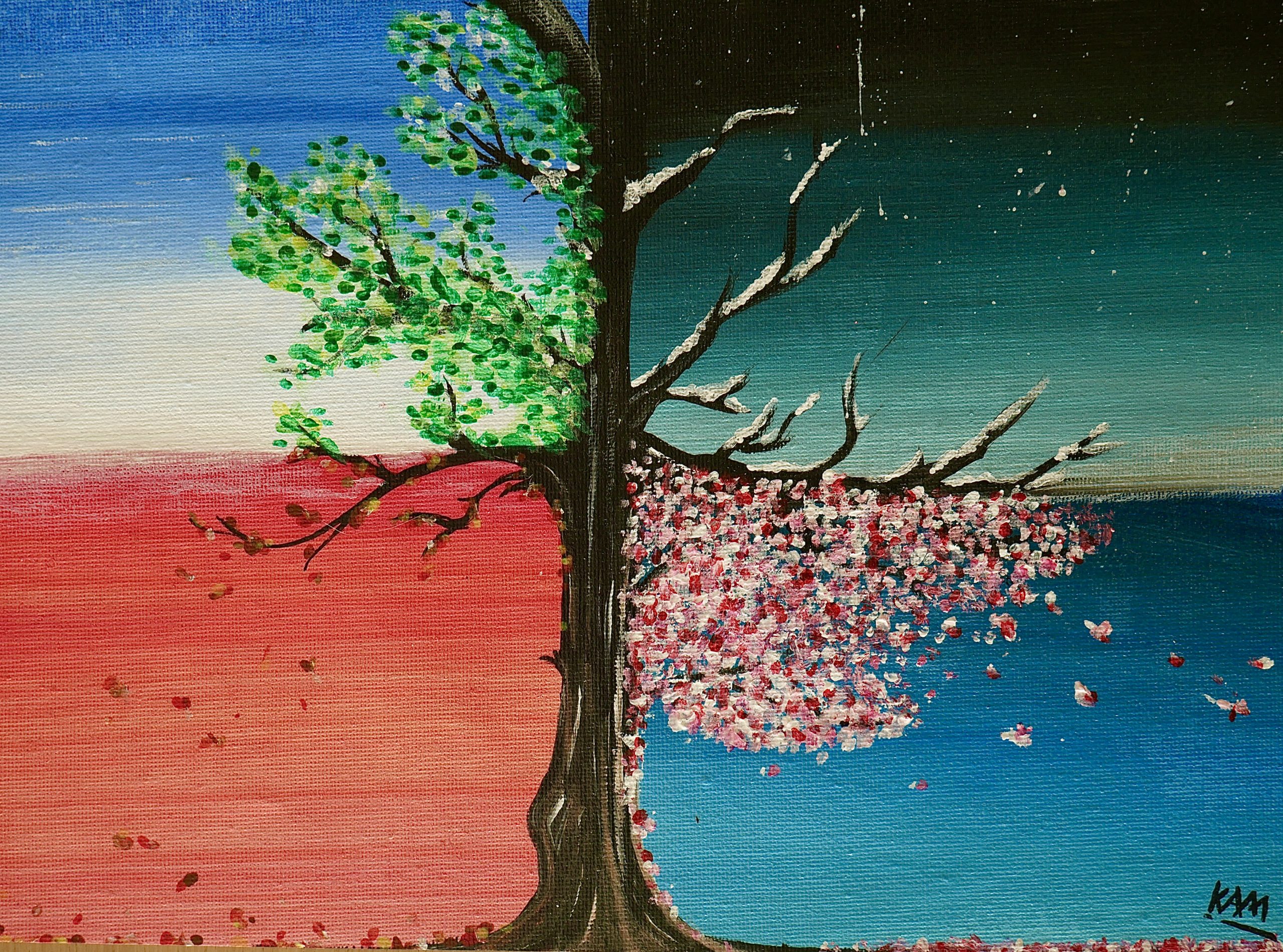 Acrylique sur feuille A4 toilé. Finition : vernis brillant. Cette oeuvre est le prototype du grand tableau 50x70cm Arbre aux quatre saisons. (Affiche vendue seule sans le cadre)