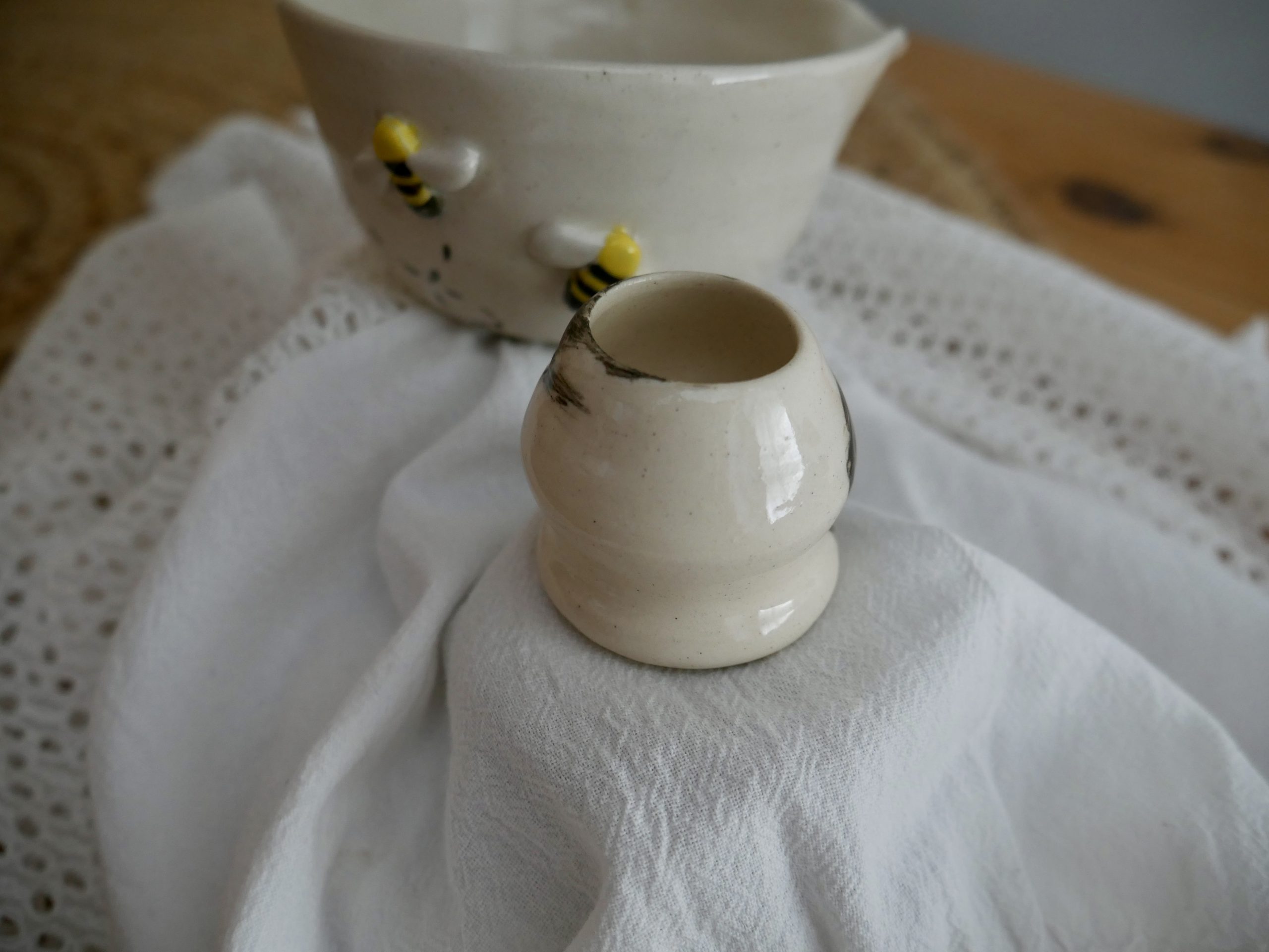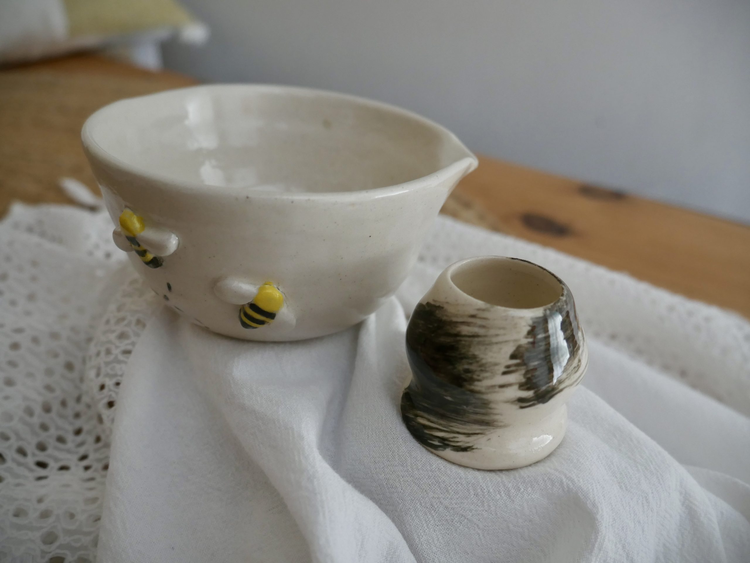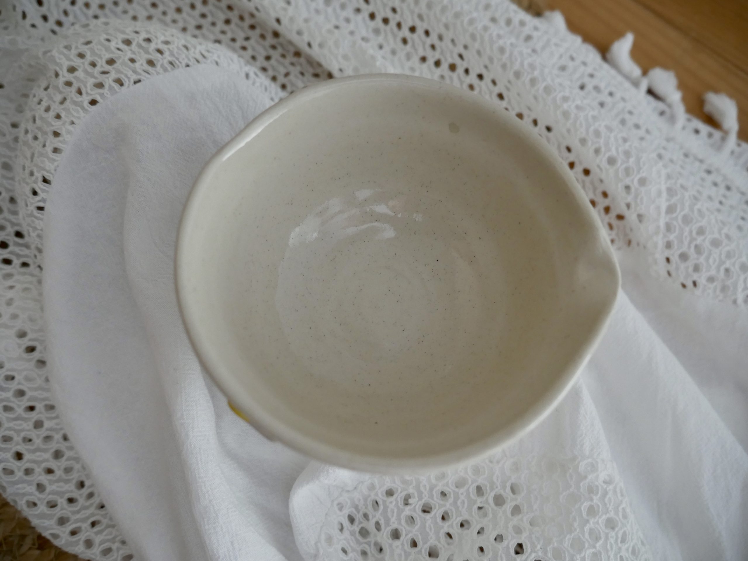 Composé d’un bol verseur (environ 190mL) et d’un support pour fouet en bambou. Ce duo à été réalisé au tour, dans mon atelier près de Bordeaux. Son émail transparent brillant permet à ce kit d’être compatible avec le contact alimentaire et de passer au lave-vaisselle. Je reste disponible pour toute demande personnalisée et sur-mesure dans l’espace contact.