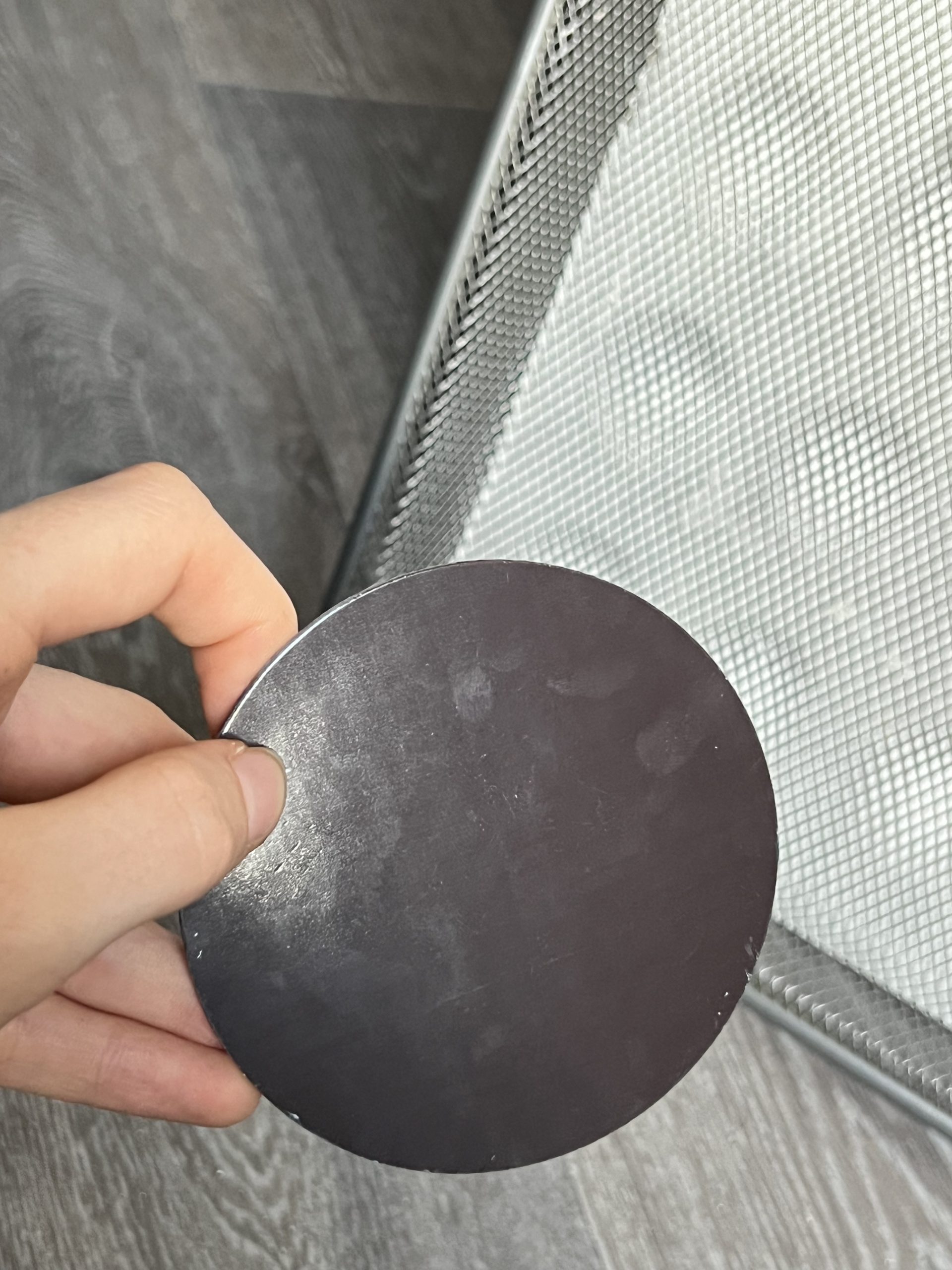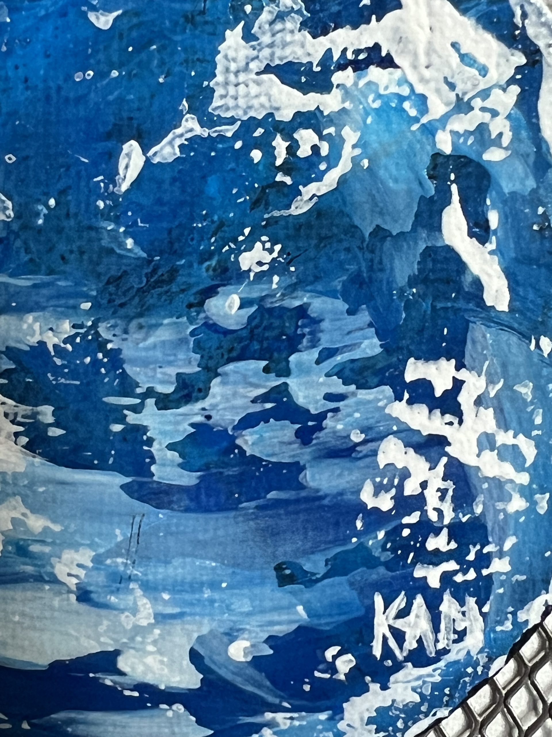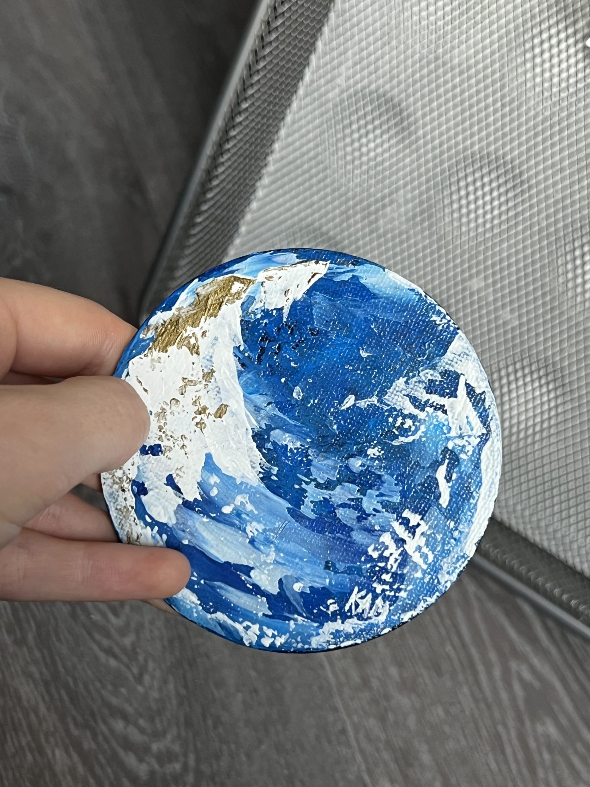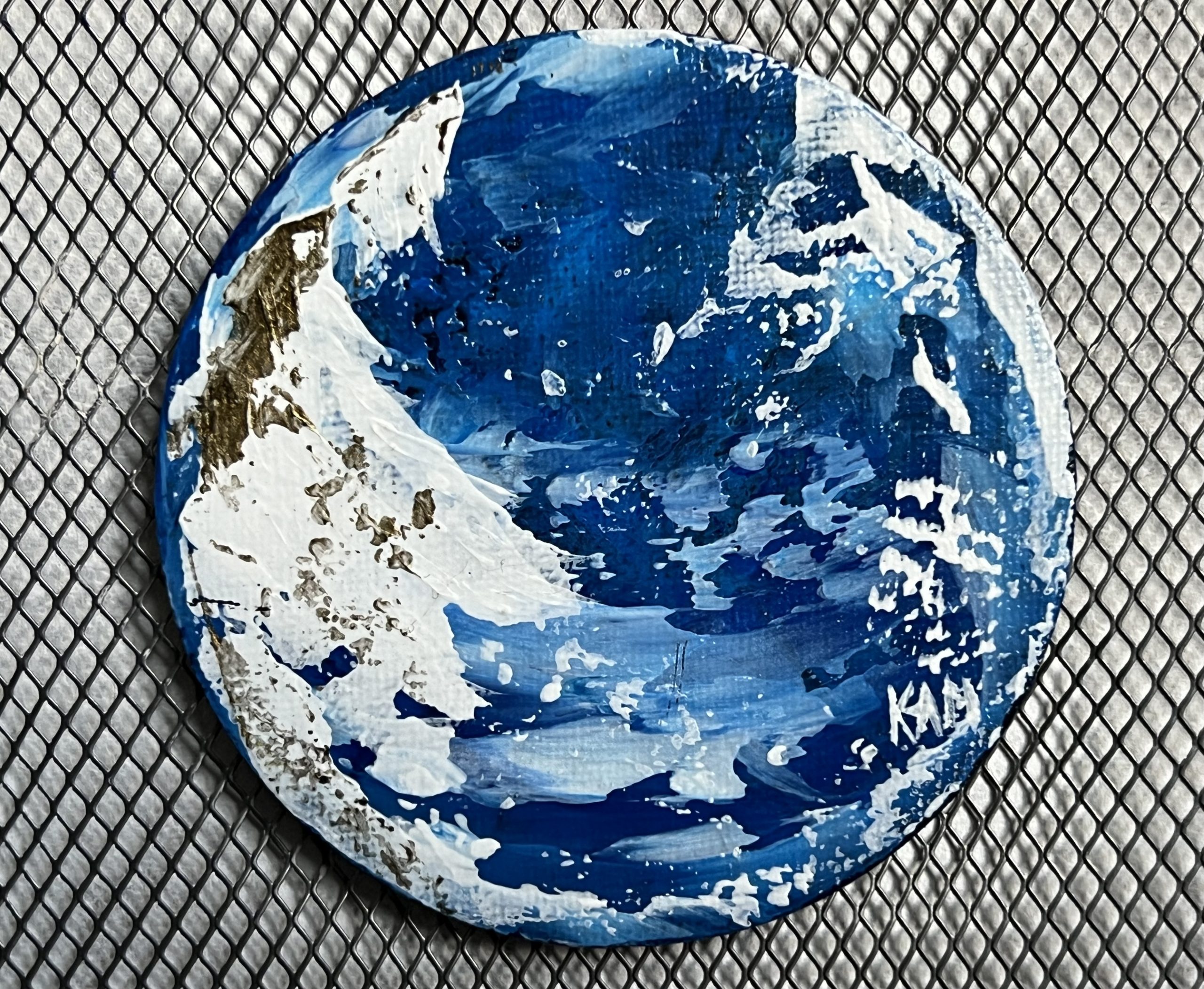 Forme Cercle ou Fleur. Acrylique sur magnet toilé. Finitions vernis brillant. Cette courte série de miniatures abstraites à été réalisée uniquement avec des tons froids et une touche de bronze brillant. Un paysage enneigé ou peut être un ouragan, à votre avis que pensais représenter l’artiste en peignant ses oeuvres ?