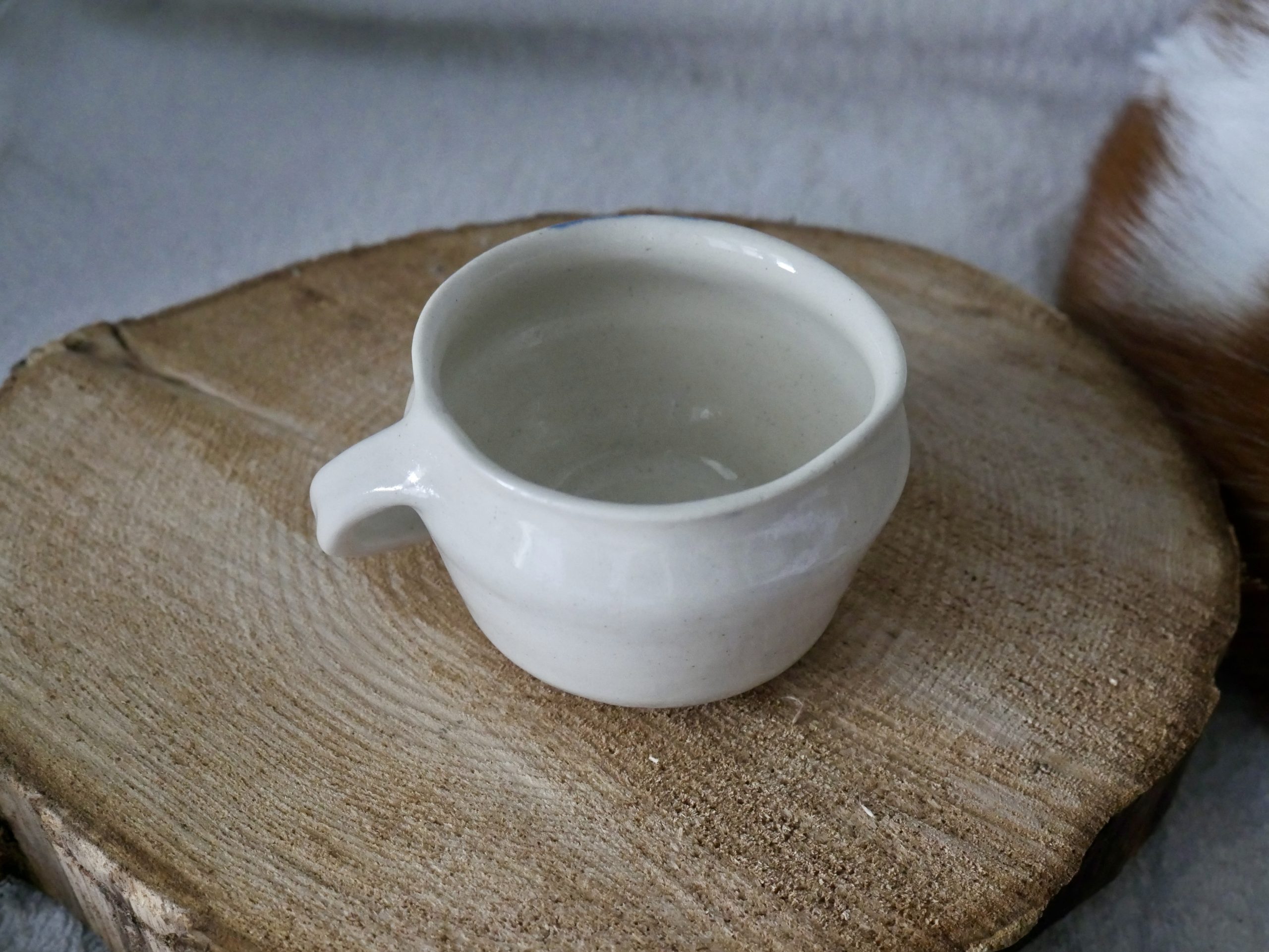 Marine a une capacité de 100mL. J’ai utilisé un grés porcelainique tourné puis orné d’une petite anse. Une touche de bleu ultramarine vient rappeler mon amour pour la peinture. La finition est un émail transparent brillant permettant l’étanchéité de la tasse. Vous pouvez la passer au lave-vaisselle; au micro-onde et elle est favorable au contact alimentaire. Je reste disponible pour toute demande personnalisée et sur-mesure dans l’espace contact. Contenance=100mL